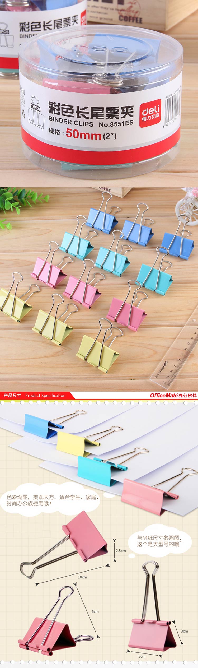 得力彩色长尾票夹 8551ES 1号 50mm