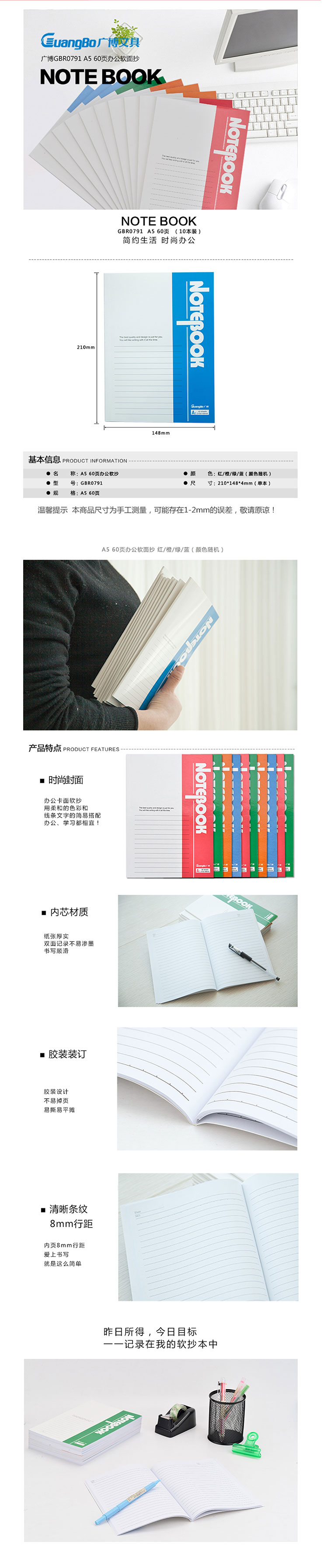 纸张厚实,双面记录不易渗墨,书写顺滑。