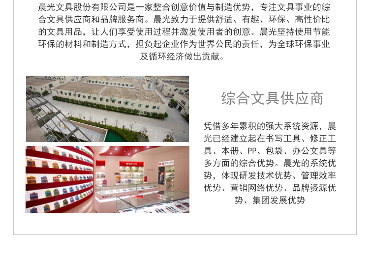 晨光(M&G)致力于整合创意价值与服务优势, 专注于综合文具产业。综合文具用品涵盖书写工具、学生文具、办公文具及其他相关产品四大领域。晨光工业园拥有全流程生产车间、模具工程、设备研发中心,通过整合包括原料、技术、资本、市场、人才和创意资源,为客户提供性价比的文具用品,让学习和工作更快乐。一切创意,发自内心,源于智慧。