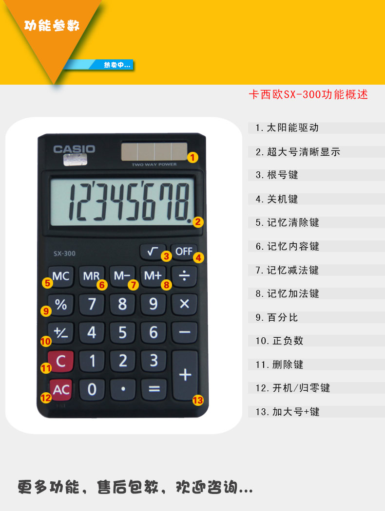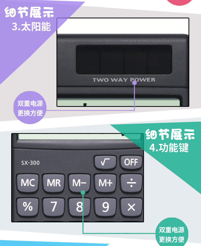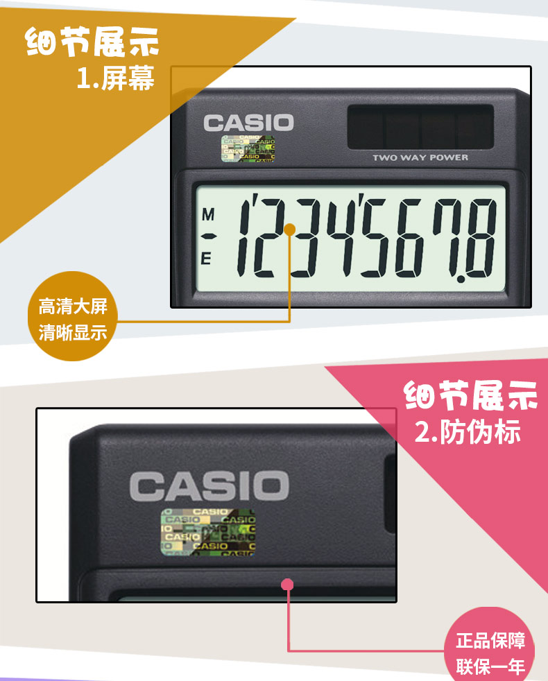 尺寸(长*宽):70*118.5mm,8位数显,电源:太阳能+纽扣电池,纽扣电池不可替换